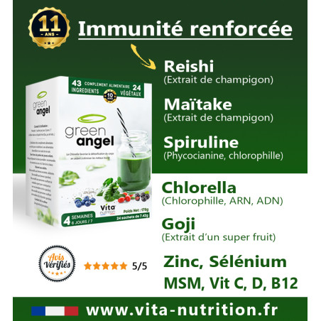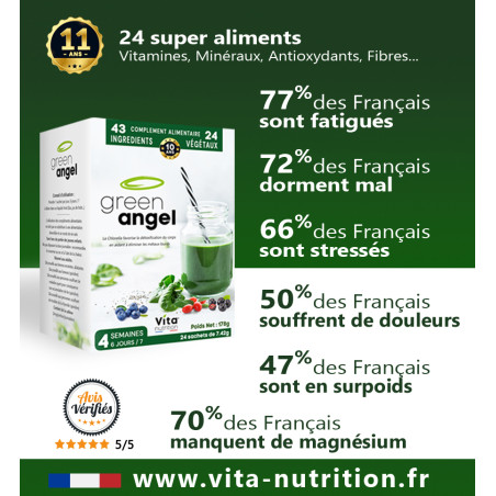 Chaque dose de Green Angel est un concentré de nature, de vie et d'amour qui apportent à vos 30.000 milliards de cellules 100% des besoins en vitamines B, C, sélénium, Zinc...