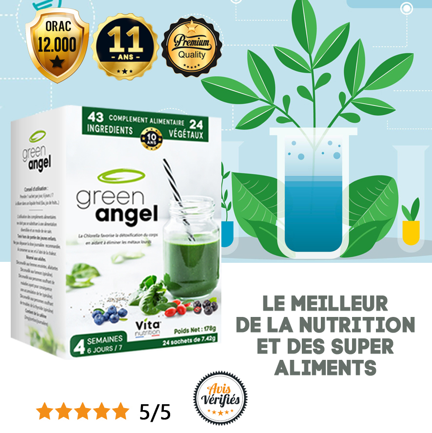 Green Angel est un complément alimentaire composé de 24 super-aliments du monde entier, incroyablement riche en substances vitales pour vos cellules : Vitamines - Minéraux - Oligoéléments - Pigments - Antioxydants - Enzymes.